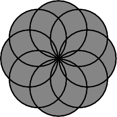 The next example computes the union of eight unit discs whose centers are placed a unit distance from the origin, as depicted to the right. The example also allows users to provide a different number of discs through the command line.