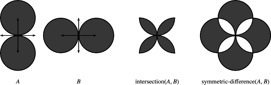 This package consists of the implementation of Boolean set-operations on point sets bounded by weakly \( x\)-monotone curvesA continuous planar curve \( C\) is weakly \( x\)-monotone if every vertical line intersects it at most once, or if it is vertical. Hereafter we refer to weakly \( x\)-monotone curves as \( x\)-monotone curves. in 2-dimensional Euclidean space. In particular, it contains the implementation of regularized Boolean set-operations, intersection predicates, and point containment predicates. Figure 17.1 shows simple examples of such operations.