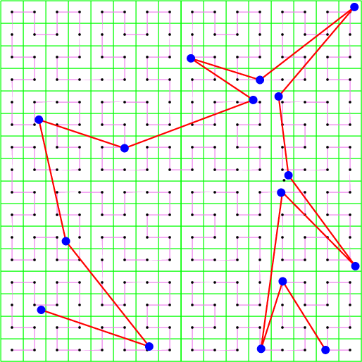 If instead of subdividing the square in a fixed way at its center, as above, we subdivide it by splitting at the median point (in \( x\) or \( y\) directions alternating), we construct a 2-d tree adapted to the point set. This tree can be visited in a similar manner and we get also a suitable ordering of the points; we call this subdivision policy: median policy (see Figure 104.3).