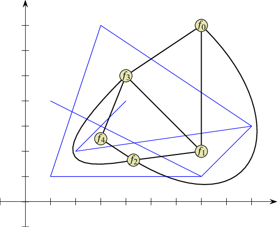 The following example constructs the same arrangement constructed by the program coded in Arrangement_on_surface_2/bgl_primal_adapter.cpp; see Figure 36.49. Then, it performs a breadth-first search traversal on the face graph, starting from the unbounded face. The DCEL faces are extended with an unsigned integer indicating the discovered time of the face. The code uses a visitor that obtains the times and writes them into a property map that updates the faces accordingly. Figure 36.50 shows the graph dual to the arrangement. It is clear that the unbounded face \(f_0\) is discovered at time \(0\), the neighboring faces \(f_1\), \(f_3\), and \(f_4\) are discovered at times \(1\), \(2\), and \(3\), and finally \(f_2\) is discovered at time \(4\).