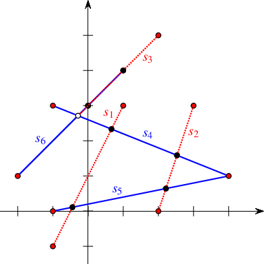 In the following example we construct a simple arrangement of six line segments, as depicted in Figure 36.46, while maintaining the curve history. Note that the input segments \(s_1\) and \(s_3\) overlap over two edges. The example demonstrates the usage of the special traversal functions. It also shows how to issue point-location queries on the resulting arrangement (the query points \(q_1\), \(q_2\), and \(q_3\) are drawn as crosses), using the auxiliary function locate_point() defined in the header file point_location_utils.h; see also Section Point-Location Queries.