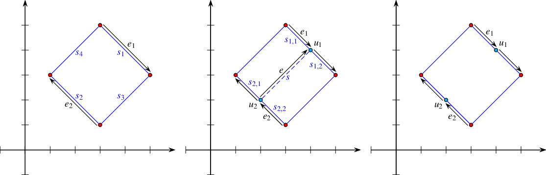 The following example program shows how the edge-manipulation functions can be used. The program works in three steps, as demonstrated in Figure 36.5. Note that the program uses the fact that split_edge() returns one of the new halfedges (after the split) that has the same direction as the original halfedge (the first parameter of the function) and is directed towards the split point. Thus, it is easy to identify the vertices \(u_1\) and \(u_2\) associated with the split points.