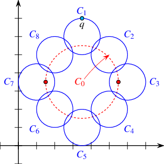 Figure 36.47 An arrangement with history of nine circles as constructed in Arrangement_on_surface_2/edge_manipulation_curve_history.cpp. Note the vertical tangency points of \(c_0\), marked as dark dots, which subdivide this circle into an upper half and a lower half, each consists of 9 edges. The large circle \(c_0\) is eventually removed from the arrangement, with all 18 edges it induces.