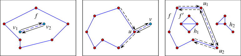 Figure 36.3 Illustrations of the various specialized insertion procedures. The inserted \(x\)-monotone curve is drawn as a dashed line, surrounded by two solid arrows that represent the pair of twin halfedges added to the DCEL. Existing vertices are shown as red discs, while new vertices are shown as blue discs. Existing halfedges that are affected by the insertion operations are drawn as dashed arrows. (a) Inserting a curve as a new hole inside the face \(f\). (b) Inserting a curve from an existing vertex \(u\) that corresponds to one of its endpoints. (c) Inserting an \(x\)-monotone curve, the endpoints of which correspond to existing vertices \(u_1\) and \(u_2\). In this case, the new pair of halfedges closes a new face \(f'\). The hole \(h_1\), which belonged to \(f\) before the insertion, becomes a hole in this new face.