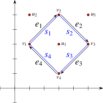 The following program demonstrates the usage of the arrangement member-functions for manipulating isolated vertices. It first inserts three isolated vertices, \(u_1\), \(u_2\), and \(u_3\), located inside the unbounded face of the arrangement. Then, it inserts four line segments \(s_1, \ldots, s_4\), that form a square hole inside the unbounded face (see Figure 36.4 for an illustration). Finally, it traverses the vertices and removes those isolated vertices that are still contained in the unbounded face ( \(u_2\) and \(u_3\) in this case):
