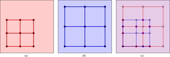 The example program listed below computes the overlay, depicted in Figure 36.45, of the two arrangements depicted in (a) and (d). Each feature of the input arrangements and of the overlay arrangement is extended with an RGB color stored as an unsigned int. The vertices, halfedges, and faces of the red arrangement are assigned three different shades of red. Similarly, the vertices, halfedges, and faces of the blue arrangement are assigned three different shades of blue. Using an instance of the Overlay_color_traits class template as the overlay traits, each feature of the overlay arrangement is assigned a color that is a blend of the colors attached to the inducing features.