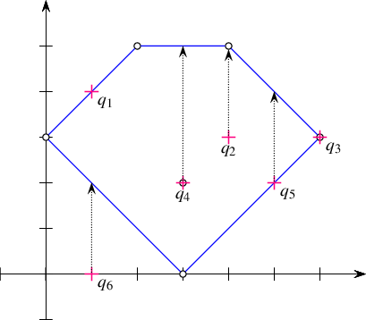 One of the most useful query types defined on arrangements is the point-location query: Given a point, find the arrangement cell that contains it. Typically, the result of a point-location query is one of the arrangement faces, but in degenerate situations the query point can lie on an edge, or it may coincide with a vertex.
