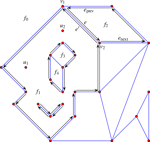 Figure 36.2 An arrangement of interior-disjoint line segments with some of the DCEL records that represent it. The unbounded face \(f_0\) has a single connected component that forms a hole inside it, and this hole comprises of several faces. The halfedge \(e\) is directed from its source vertex \(v_1\) to its target vertex \(v_2\). This edge, together with its twin \(e'\), correspond to a line segment that connects the points associated with \(v_1\) and \(v_2\) and separates the face \(f_1\) from \(f_2\). The predecessor \(e_{\rm prev}\) and successor \(e_{\rm next}\) of \(e\) are part of the chain that form the outer boundary of the face \(f_2\). The face \(f_1\) has a more complicated structure as it contains two holes in its interior: One hole consists of two adjacent faces \(f_3\) and \(f_4\), while the other hole comprises of two edges. \(f_1\) also contains two isolated vertices \(u_1\) and \(u_2\) in its interior.