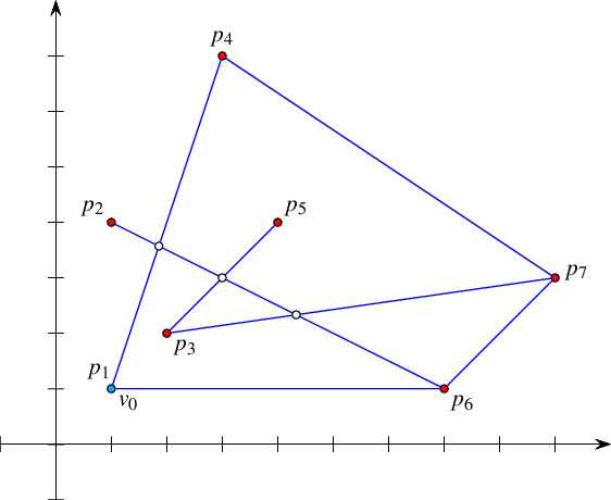 In the following example we construct an arrangement of seven line segments, as shown in Figure 36.49. Then, it uses the BGL generic implementation of Dijkstra's shortest-paths algorithm to compute the sum of squared distances to all vertices from the lexicographically smallest vertex \(v_0\) in the arrangement. Note the usage of the Arr_vertex_property_map class template in the call to boost::dijkstra_shortest_paths() and in the definition of the distance property-map. We instantiate a property map that attaches a number of type Number_type (which is a type of unlimited precision) to each vertex. The number represents the sum of squared distances of the vertex from \(v_0\).