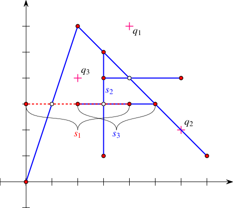 In the following example we construct a simple arrangement of six line segments, as depicted in Figure 36.46, while maintaining the curve history. Note that the input segments \(s_1\) and \(s_3\) overlap over two edges. The example demonstrates the usage of the special traversal functions. It also shows how to issue point-location queries on the resulting arrangement (the query points \(q_1\), \(q_2\), and \(q_3\) are drawn as crosses), using the auxiliary function locate_point() defined in the header file point_location_utils.h; see also Section Point-Location Queries.
