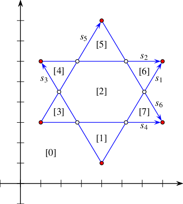 Figure 36.49 An arrangement of seven line segments, as constructed by Arrangement_on_surface_2/bgl_primal_adapter.cpp and Arrangement_on_surface_2/bgl_dual_adapter.cpp.