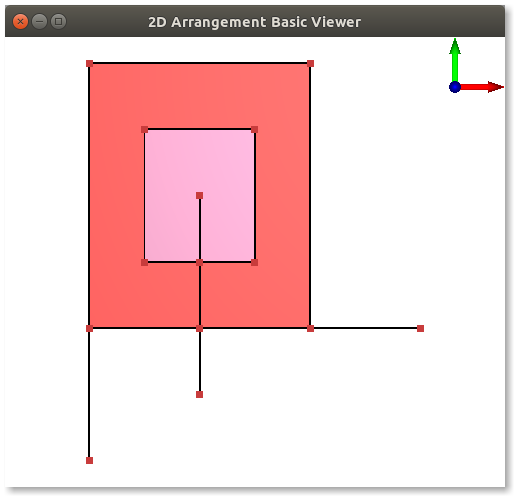 Figure 36.48 A snapshot of the window created by the program Arrangement_on_surface_2/draw_arr.cpp. The constructed arrangement consists of 14 vertices, 15 edges, and 3 faces. Notice that the colors are generated at random.