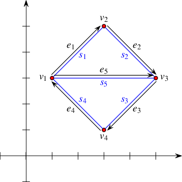 The program below demonstrates the usage of the four specialized insertion functions. It creates an arrangement of five line segments \(s_1, \ldots, s_5\), as depicted in Figure 36.4. Notice that in all figures in the rest of this chapter the coordinate axes are drawn only for illustrative purposes and are not part of the arrangement. The first line segment \(s_1\) is inserted in the interior of the unbounded face, while the four succeeding line segments \(s_2, \ldots, s_5\) are inserted using the vertices created by the insertion of preceding segments. The arrows in the figure mark the direction of the halfedges \(e_1, \ldots, e_5\) returned from the insertion functions. The resulting arrangement consists of three faces, where the two bounded faces form together a hole in the unbounded face.