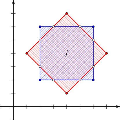 The example program listed below computes the overlay, depicted in Figure 36.45, of the two arrangements depicted in (a) and (d). Each feature of the input arrangements and of the overlay arrangement is extended with an RGB color stored as an unsigned int. The vertices, halfedges, and faces of the red arrangement are assigned three different shades of red. Similarly, the vertices, halfedges, and faces of the blue arrangement are assigned three different shades of blue. Using an instance of the Overlay_color_traits class template as the overlay traits, each feature of the overlay arrangement is assigned a color that is a blend of the colors attached to the inducing features.