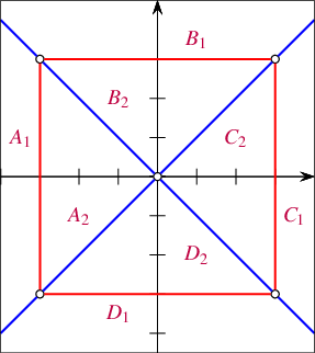 The next example, depicted in Figure 36.44, demonstrates the face overlay of two arrangements that have unbounded faces as well as bounded ones. The first arrangement (blue) is induced by the two lines \(y = x\) and \(y = -x\), which subdivide the plane into four unbounded faces, labeled \(A\), \(B\), \(C\) and \(D\). The second arrangement (red) comprises four line segments that form a square-shaped face indexed \(1\). The unbounded face is indexed 2. When the two arrangements are overlaid, each of the four faces \(A\), \(B\), \(C\) and \(D\) is split into an unbounded face (indexed 2) and a bounded face (indexed 1), so the faces of the resulting arrangement are labeled \(A_1, A_2, \ldots, D_1,
