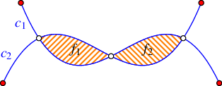 Geometric arrangements, or arrangements for short, are subdivisions of some space induced by geometric objects. Figure 36.1 shows an arrangement of two curves \(c_1\) and \(c_2\) in the plane. It has three faces—two bounded faces \(f_1\) and \(f_2\) (filled with diagonal-stripe patterns) and an unbounded face. The arrangement has seven vertices—four represent the endpoints of \(c_1\) and \(c_2\) (drawn as small discs), and three represent the intersection points of the two curves (drawn as small rings). The arrangement also has eight edges, each of which is a maximal portion of one curve not intersecting the other.