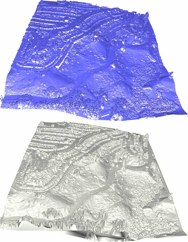 - DSM: Digital Surface Model, a model of the whole scanned surface including buildings and vegetation. We use a TIN to store the DSM.