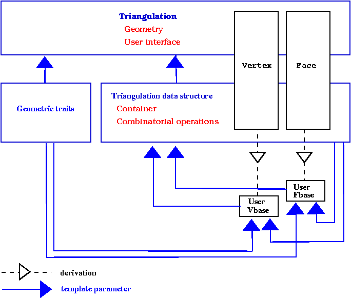 To be able to adapt to various needs, a highly flexible design has been selected for 2D triangulations. We have already seen that the triangulation classes have two parameters: a geometric traits class and a triangulation data structure class which the user can instantiate with his own customized classes.