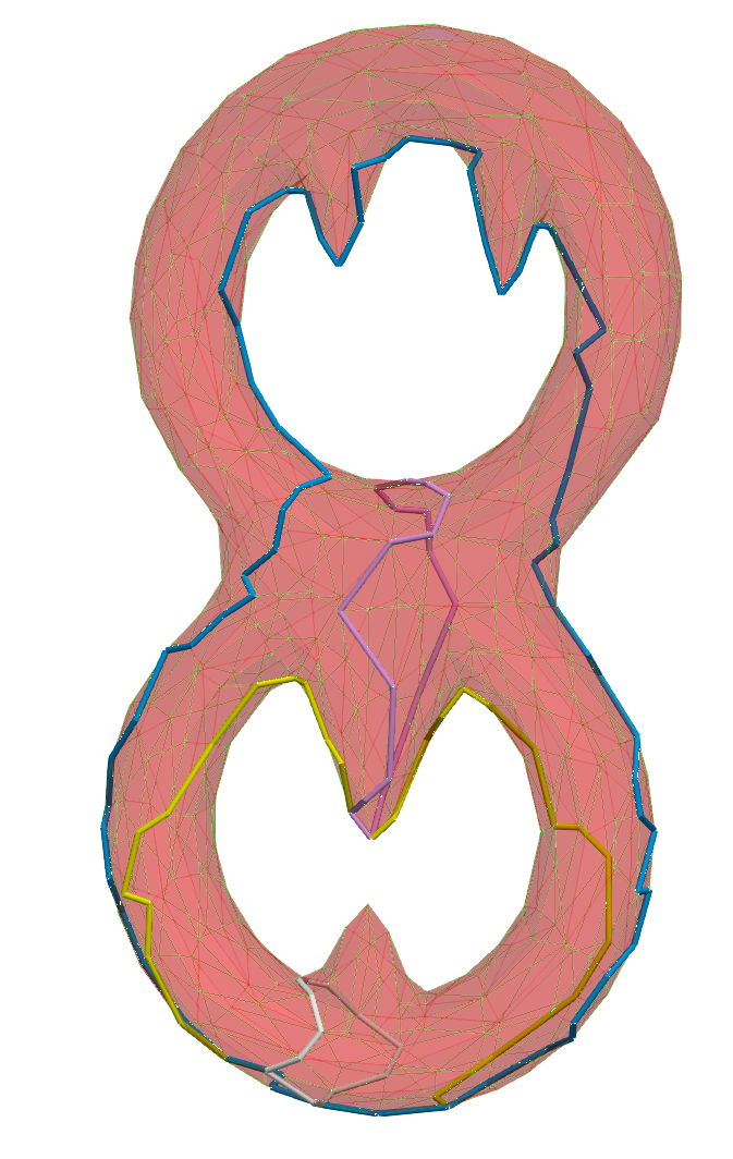 The figure above illustrates next persistent hole (dimension 0 hole) which duration is 0.684 along z. The cell \(\tau\) is added at time 1237 and fills the 0-hole (connected component) introduced at time 756 by the cell \(\sigma\). The persistent generator associated to \(\sigma\) is simply the cell itself identifying its connected component. The persistent generator associated to \(\tau\) is a 1-chain (depicted in yellow) connecting \(\sigma\) to the critical cell identifying the second connected component.