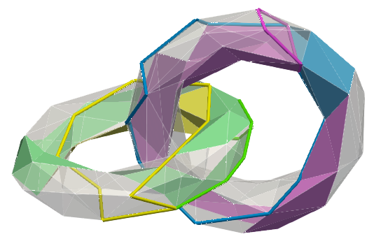 cell and dimension q,co_faces is true (sometimes easier to view cohomology generators)Below, a sample mesh with, (left) homology generators, (right) two examples of cohomology generators (corresponding generators/co-generators bear similar colours):