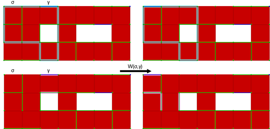 The W operation modifies the cohomology generator associated to \(\gamma\) (while preserving is associated homology generator). The following figure illustrates the W operation.