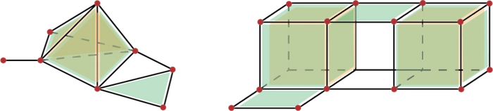 Figure 92.2 Illustration of complexes. Left: a simplicial complex of dimension 3; Right: A cubical complex of dimension 3.