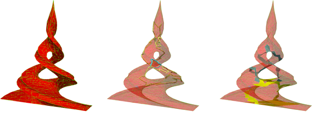 Figure 92.1 HDVF on a twirl model. Left: a perfect HDVF over the model; Middle: Homology generators associated to this HDVF; Right: Corresponding cohomology generators.