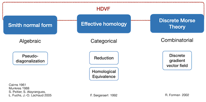 Figure 92.10 Overview of approaches in computational homology. HDVFs are in-between discrete Morse theory and effective homology (and they encompass persistent homology, relative homology and tri-partitions).