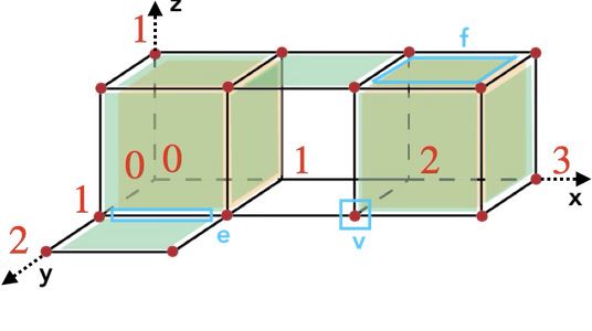 with \(n_i\in \mathbb N\) and \(\delta_i\in\{0,1\}\) for \(i=1\ldots d\). The dimension of such a cell is \(\sum_{i=1}^d \delta_i\). As stated in previous section, a complex is closed under the "face" operation (if a cell belongs to the complex, so do its faces).