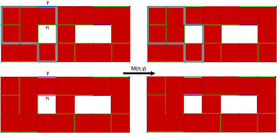 Figure 94.11 M operation on a cubical complex \(K\). Left: perfect HDVF over \(K\) with cells \((\pi, \gamma)\) meeting the M operation condition (blue: homology generator associated with \(\gamma\), pink: cohomology generator associated with \(\gamma\)); Right: perfect HDVF obtained with \(M(\pi,\gamma)\) and updated generators (associated to \(\pi\) which is now critical).
