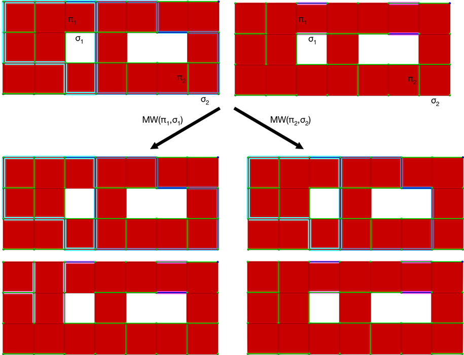 Figure 94.13 MW operation on a cubical complex \(K\). Top: perfect HDVF over \(K\) with cells \((\pi_1, \sigma_1)\) and \((\pi_2, \sigma_2)\) meeting the MW operation condition (blue: homology generators, pink: cohomology generators); Down, left: perfect HDVF obtained with \(MW(\pi_1,\sigma_1)\) and updated generators (a cohomology generator is modified); Down, right: perfect HDVF obtained with \(MW(\pi_2,\sigma_2)\) and updated generators (a homology generator is modified).