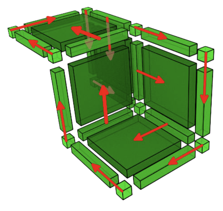 with \(n_i\in \mathbb N\) and \(\delta_i\in\{0,1\}\) for \(i=1\ldots d\). The dimension of such a cell is \(\sum_{i=1}^d \delta_i\). As stated in previous section, a complex is closed under the "face" operation (if a cell belongs to the complex, so do its faces).