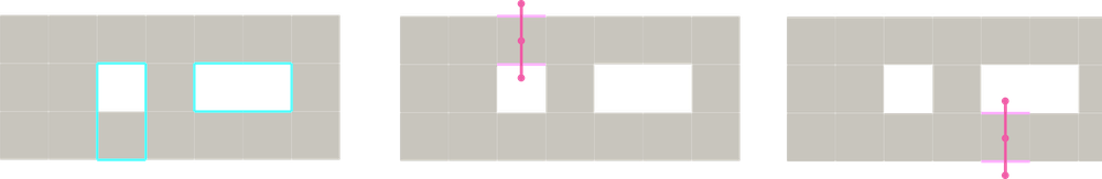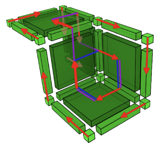 Figure 94.8 Illustration of homology and cohomology generators for a simple 2D cubical complex \(C\) (computed with HDVFs). Left: both generators of \(H_1(C)\); Middle, right: both cohomology generators \(H^1(C)\) (for convenience, the dual of cohomology generators has been displayed with bulleted pink lines).