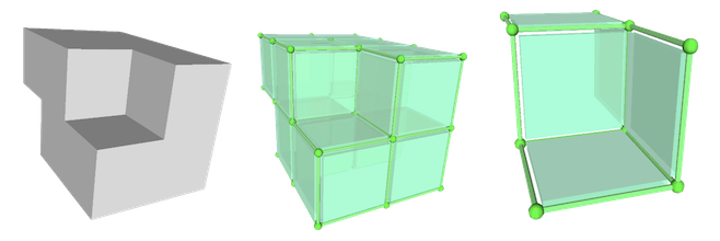 Figure 94.15 Primal and dual constructions of cubical chain complexes from a binary volume. Left: a 3D binary volume; Middle: PRIMAL cubical (chain) complex associated to the volume; Right: DUAL cubical (chain) complex associated to the volume).