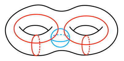 Figure 94.6 Illustration of the holes of a double torus. Black: 1 connected component (dimension 0); Red: 4 holes of dimension 1; Blue 1 cavity of dimension 2.