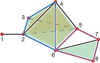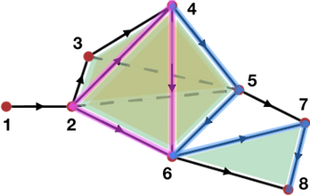 Figure 94.3 Examples of chains representation in a simplicial complex (with \(A = \mathbb Z\)). Pink: representation the 1-chain (of edges) \(\gamma_1 = e_{24}+e_{46}-e_{26}\); Blue: representation of the 1-chain \(\gamma_2 = e_{45}+e_{56}+e_{67}+e_{78}\).