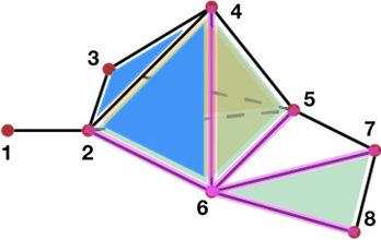 Figure 94.5 Illustration of the coboundary morphism (with \(A = \mathbb Z\)) Pink: coboundary of vertex \(v_6\) ( \(\partial^0(v_6) = e_{26} + e_{46}+e_{56} - e_{67} - e_{68}\)); Blue: coboundary of edge \(e_{24}\) ( \(\partial^1(e_{24} ) = f_{246} - f_{234}\)).