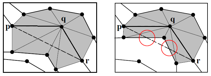 The polyline simplification algorithm operates on a triangulation class from Chapter 2D Triangulations, namely Constrained_triangulation_plus_2. This data structure allows to remove vertices of a polyline constraint, while keeping the points of the removed vertices of the polyline constraint. The fact that it is a triangulation allows to perform the topology check for vertices p,q,r efficiently, as this can be decided based on the set of vertices adjacent to q in the triangulation.
