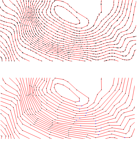 The scaled maximum works well in areas with close neighboring polylines, while the absolute maximum works better in areas where the polylines are far apart. In certain applications such as cartographic contours, there are both dense and spare areas, so a good strategy is to use a scaled or an absolute maximum depending on the case.