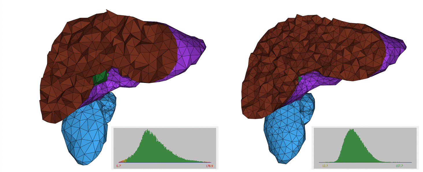 It is also possible to use a custom sizing function, like for example the same sizing field as the one used for initial tetrahedral mesh generation using the CGAL 3D Mesh Generation package, and consecutive consistent isotropic remeshing, as shown by Figure 65.3. Note that the remeshed version is denser than the one generated by CGAL::make_mesh_3(). This happens because here, the sizing field is used both as a lower and an upper bound for edge lengths, whereas in mesh generation it is used only as an upper bound on simplex sizes.