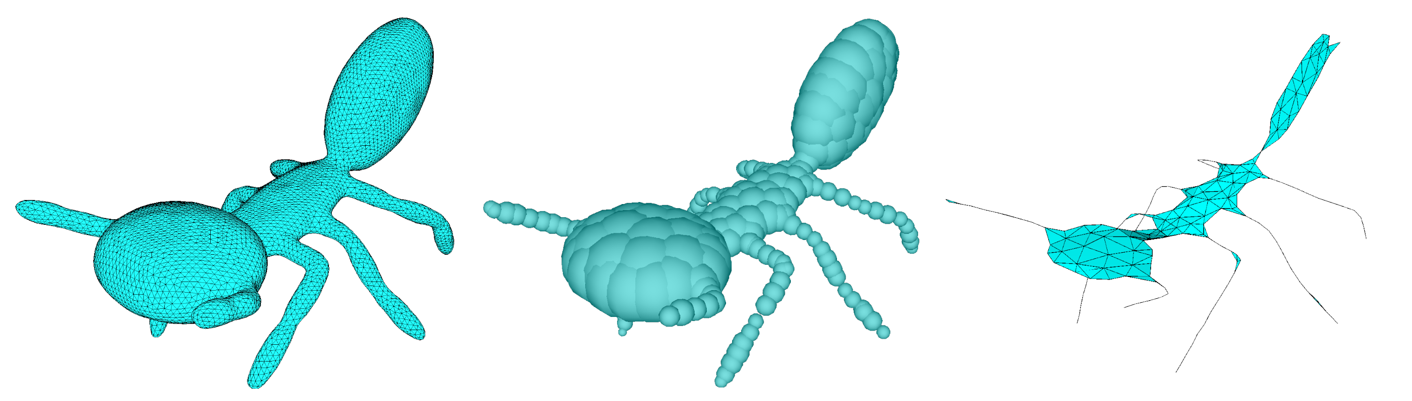 This package implements a skeletonization algorithm [1] that extracts a coarse, discrete approximation of the medial axis from a triangulated surface mesh without borders. Unlike the Surface_mesh_skeletonization package, which computes a purely curve-based (1D) skeleton, the output of this method is a non-manifold triangle mesh that may contain both curve (1D) and surface (2D) elements, a structure sometimes referred to as a medial mesh. Each vertex of the resulting mesh corresponds to a medial sphere, and the edges and faces encode the adjacency relationships between these spheres. One can reconstruct the original mesh by interpolating between spheres according their adjacency relationships. For each edge, interpolating between two spheres yields a medial cone. For each face, interpolating between three spheres yields a medial slab.