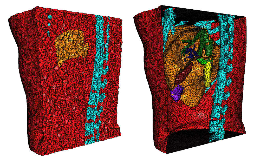 We mesh image number 2 from the 3D-IRCADb-01 (available at https://www.ircad.fr/research/data-sets/liver-segmentation-3d-ircadb-01/) public database. The size of this image is 512x512x172 voxels (about 45M voxels). The size of the voxels is 0.78mm x 0.78mm x 1.6mm. Figure 63.24 shows the mesh obtained for size set to 4.