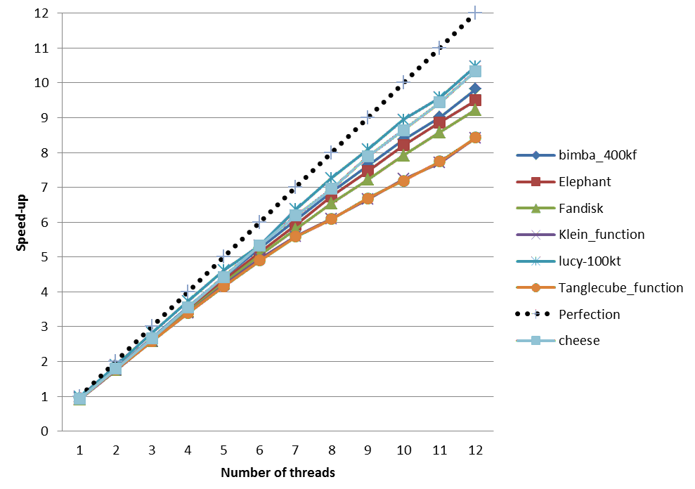 We provide below speed-up charts generated using the parallel version of the meshing algorithms of CGAL 4.5. The machine used is a PC running Windows 7 64-bits with two 6-core Intel Xeon CPU X5660 clocked at 2.80 GHz with 32GB of RAM. The program has been compiled with Microsoft Visual C++ 2012 in Release mode.