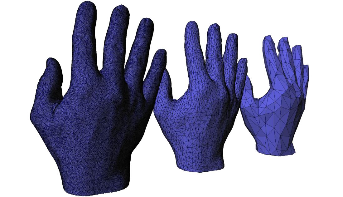 Surface mesh simplification is the process of reducing the number of faces used in a surface mesh while keeping the overall shape, volume and boundaries preserved as much as possible. It is the opposite of subdivision.
