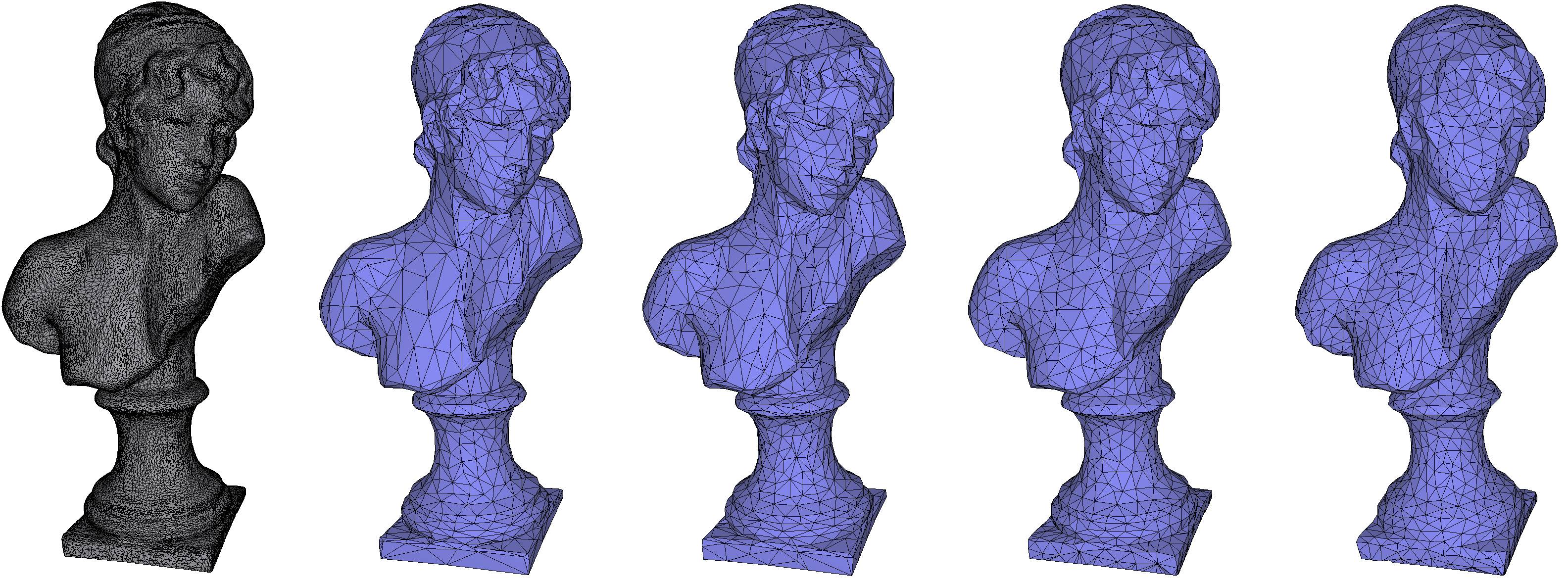 An extension of the Garland-Heckbert was proposed by Trettner and Kobbelt [7], who proposed the concept of probabilistic quadrics. In this new approach, the energy minimization is no longer performed using distances to input planes or polygons as in the classic version; instead, input geometry is made uncertain by introducing Gaussian noise in the input (vertex positions and face normals). This variance naturally deteriorates the tightness of the result, but on the other hand it enables creating more uniform triangulations and the approach is more tolerant to noise, while still maintaining feature sensitivity.