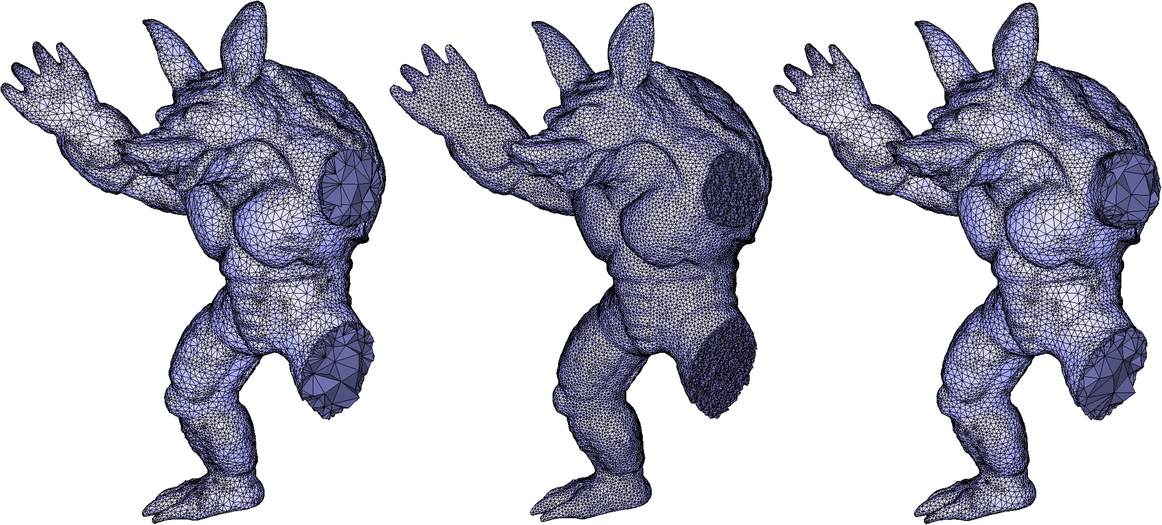 In the second example, we show how to use the provided adaptive sizing field, CGAL::Adaptive_remeshing_sizing_field, that automatically sets the target edge length to keep a mesh density consistent with the density of the input mesh.