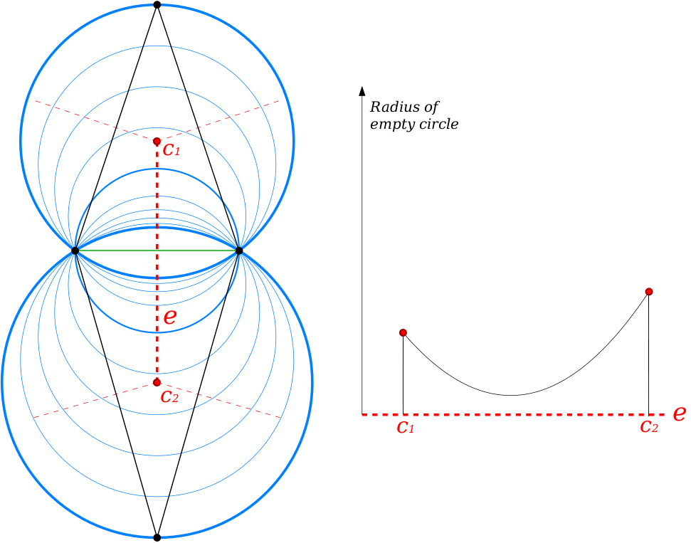 Figure 67.3 (Left) Pencil of empty circles (blue) circumscribing a Delaunay edge (green) in a 2D Delaunay triangulation (black). From the top triangle circumcenter c1 to the bottom triangle circumcenter c2, the dual Voronoi edge denoted by e (doted red) is the trace of centers of the largest circles that are empty of Delaunay vertex. (Right) The graph corresponding to the left example. The x-axis corresponds to the position of empty circle centers located on the Voronoi edge e, from c1 to c2. The y-axis is the radius value of the corresponding empty circles. In this case, the minimum radius of this pencil of empty circle is located at the midpoint of the green Delaunay edge. In our algorithm, a gate (green Delaunay edge) is said to be not alpha-traversable when the minimum radius of the pencil of empty circle is smaller than alpha.