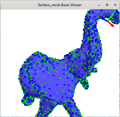 We illustrate this possibility in the following example that shows a surface mesh, while coloring the small faces in red. To do so, we use our own graphics scene options than change the color of a face depending on its size. A face is considered small if its size is below a certain threshold. This threshold can be updated by the user, pressing key 'I' to increase it and 'D' to decrease it. This is done in the key pressed function defined in the QApplication_and_basic_viewer. When the threshold changes, the graphics scene is recomputed to take the modification of the size threshold into account.