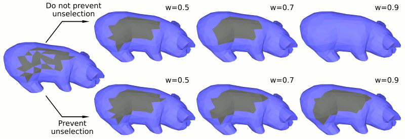 Manually selecting faces on a triangle mesh may create irregular borders (sawtooth) because of the shape of the triangles. Such borders can be regularized using the alpha expansion algorithm.