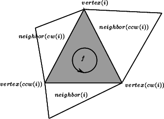 The triangulation class offers two functions int cw(int i) and int ccw(int i) which, given the index of a vertex in a face, compute the index of the next vertex of the same face in clockwise or counterclockwise order. Thus, for example the neighbor neighbor(cw(i)) is the neighbor of f which is next to neighbor(i) turning clockwise around f. The face neighbor(cw(i)) is also the first face encountered after f when turning clockwise around vertex i of f (see Figure Triangulation_ref_Fig_neighbors).